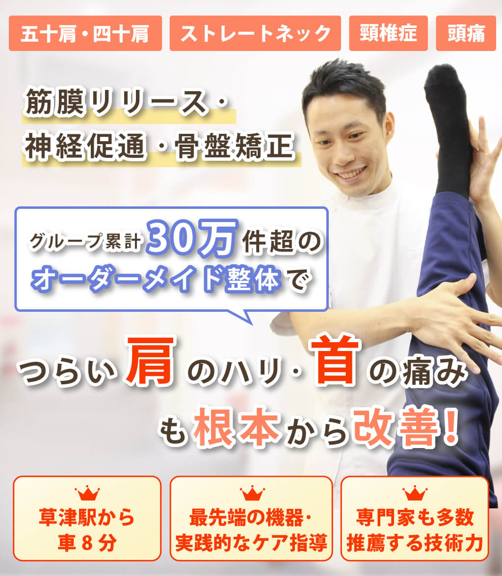 五十肩、四十肩、ストレートネック、頸椎症、頸椎ヘルニアなど首の痛みや肩こりの経験施術が豊富な整体院です。施術して終わりではなく、その後の自宅でできるセルフストレッチや生活習慣の指導もいたします。
