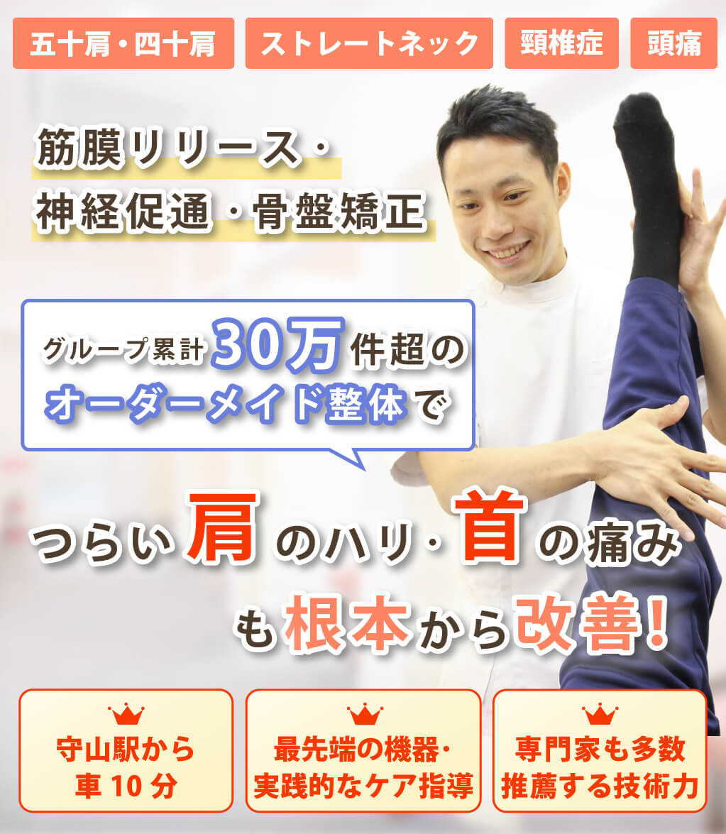 五十肩、四十肩、ストレートネック、頸椎症、頸椎ヘルニアなど首の痛みや肩こりの経験施術が豊富な整体院です。施術して終わりではなく、その後の自宅でできるセルフストレッチや生活習慣の指導もいたします。